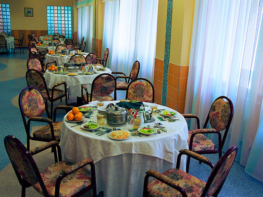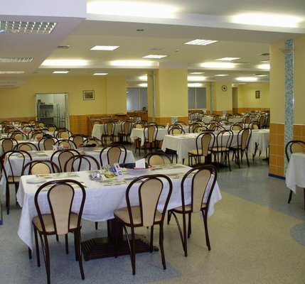 Для постояльцев санатория организовывается трехразовое питание по принципу «меню-заказ», а также возможно питание с элементами шведского стола в закусках («Улучшенное»). На территории здравницы работают два бара, два кафе, столовая и основной ресторан.