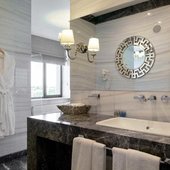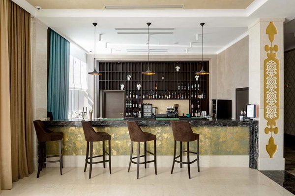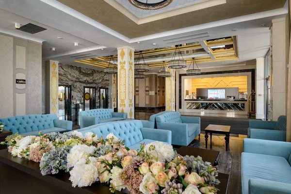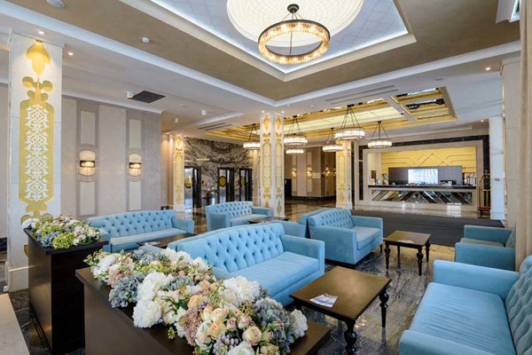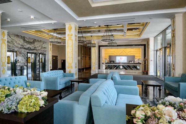 Визитная карточка отеля – ресепшн и лобби, которые украшены зеркальной мозаикой, мрамором и полированным гранитом. Стены лобби декорированы обоями под фреску. Освещение сочетается с зеркальным потолком с золотыми вставками и стеклянными люстрами. Лифты отеля также украшены золотым орнаментом и зеркалами.