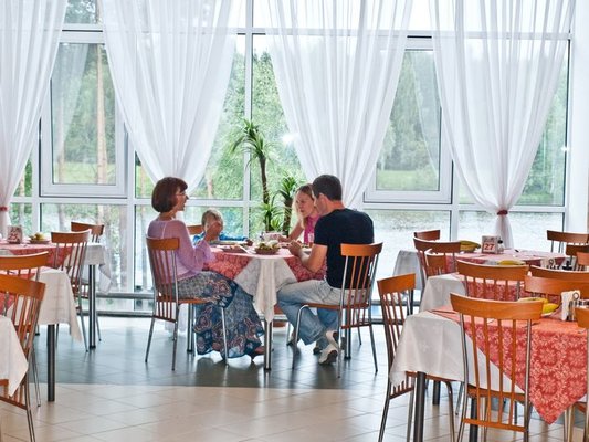 Питание отдыхающих в санатории организовано в одну смену в обеденном зале на 270 мест. Зал оборудован кондиционерами и кулерами.
