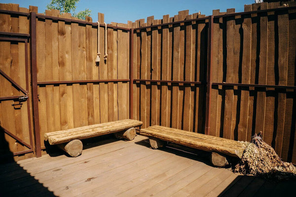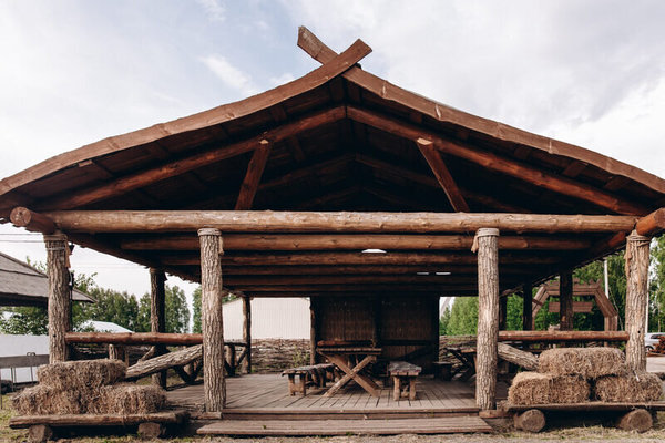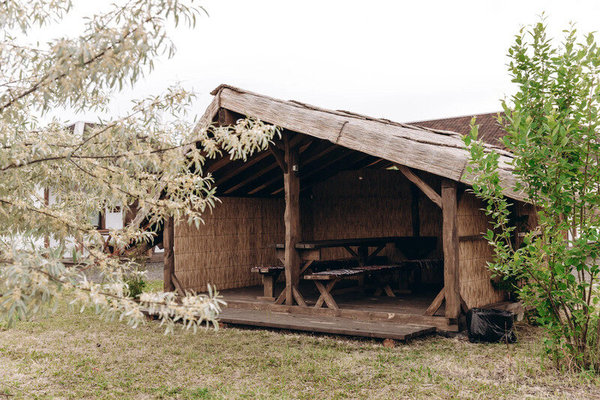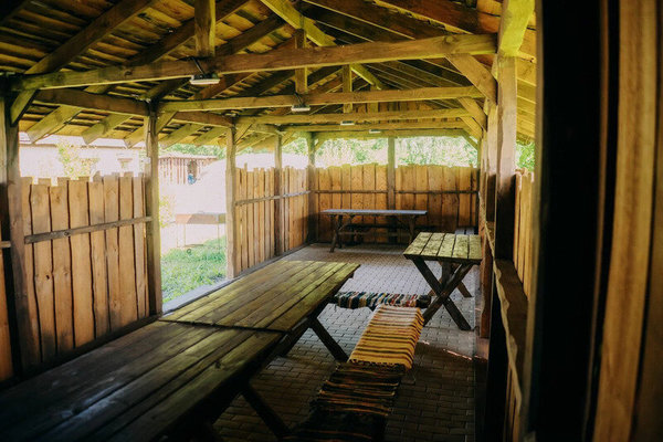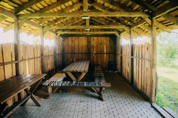- Беседка №2 до 15 человек. Площадь беседки 18 м². Имеются столы и лавки, стоимость 2500 ₽ (до 5 человек) + 400 ₽/чел (свыше 5 человек) с 12.00 до 22.00.
