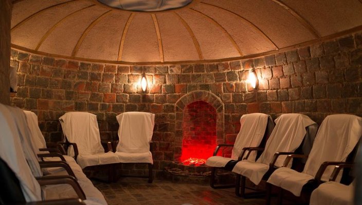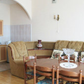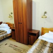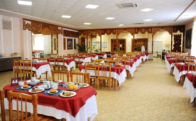 В столовой 3 зала: два общих зала на 248 посадочных мест и один банкетный зал на 40 посадочных мест. В общем зале питаются гости, выбравшие вариант размещения в 2-х местных и 1-х номерах, в банкетном зале вариант размещения коттеджи, апартаменты, люкс.