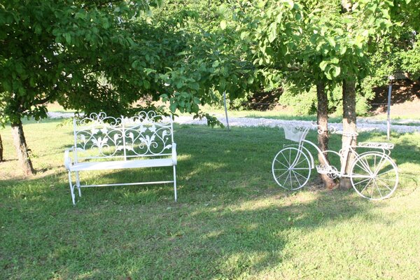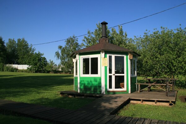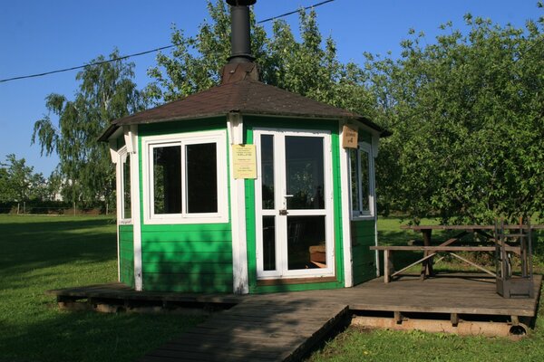 Рядом с беседкой оборудована площадка со столом и лавками, а также мангалом, что позволяет гостям наслаждаться свежим воздухом и приготовить еду на открытом огне.