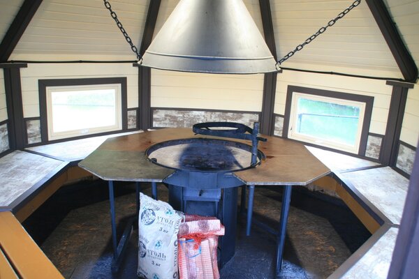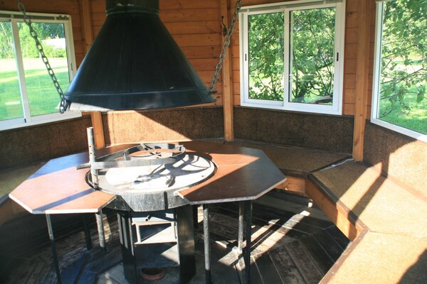 Внутри домика находится очаг, вокруг которого расположены лавки на 10 человек. Это создает удобное пространство для общения и наслаждения пищей, приготовленной на гриле.