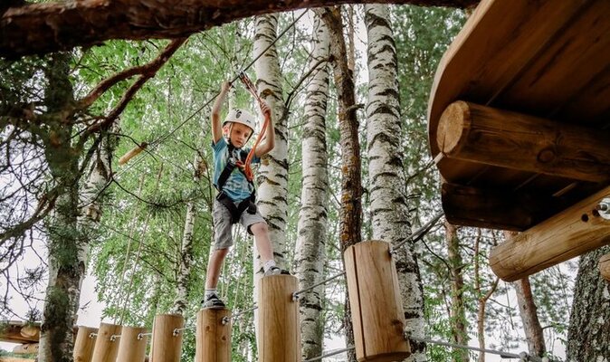 - Детская рассчитана на детей от 7 лет, ростом от 110 см, весом не более 100 кг. Располагается на высоте 1,5-2 метров, состоит из 9 зданий, протяженность 90 метров;
