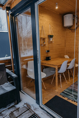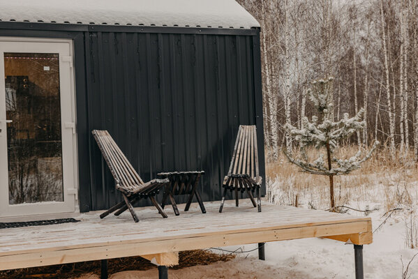 У каждого домика есть отдельная зона барбекю — стол, лавка, хороший мангал, кочерга. Шампуры, уголь, дрова, розжиг можно приобрести в глэмпинге.
