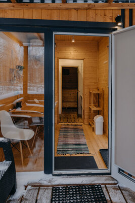 В зоне отдыха — стол на 4 гостя, радио, на веранде - 2 кресла. В бане имеется душ, раковина, ведро для обливания ледяной водой. В парной — панно из можжевельника, аромамасла, ковши для подачи жара, песочные часы и термометр, вешалки, подголовник.