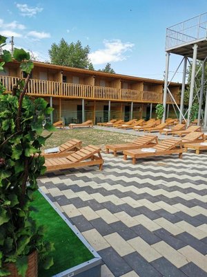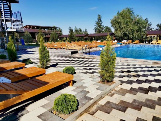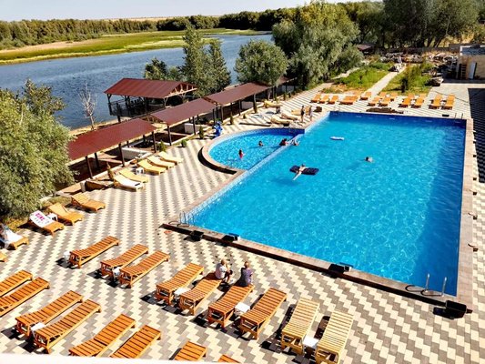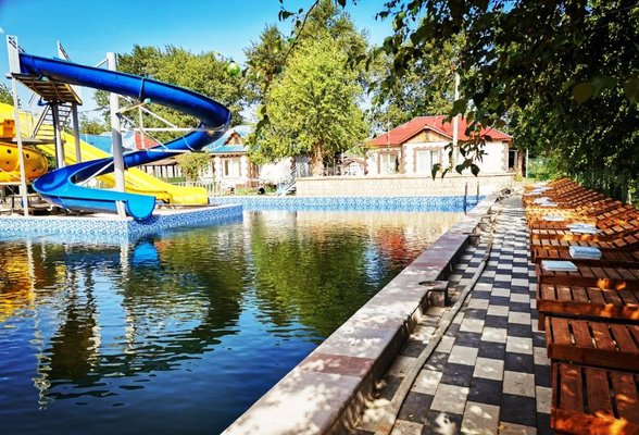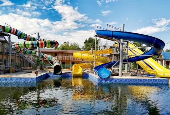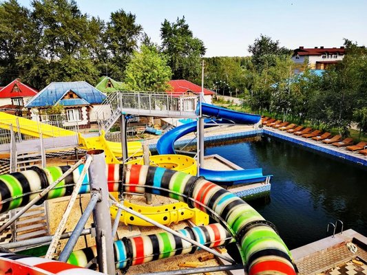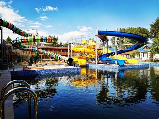 На территории турбазы находится открытый аквапарк с современной развитой инфраструктурой, нацеленной на удобство гостей. Любители активного отдыха оценят эти захватывающие водные горки.
