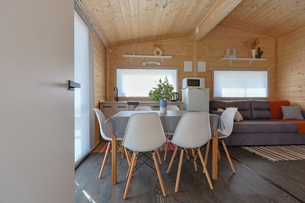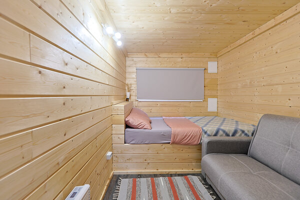 Полностью оборудованная кухня с плитой, холодильником, микроволновкой и всей необходимой посудой. Комфортный микроклимат круглый год благодаря сплит-системе. Горячая вода 24/7 благодаря бойлеру. Современный санузел с душевой кабиной и настоящей сауной для полного расслабления. Просторная лофт-зона — идеальное место для игр детей, не мешающее отдыху взрослых.