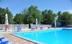 Большой открытый бассейн с шезлонгами и зонтиками. Рядом находится небольшая сцена.