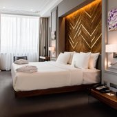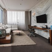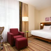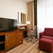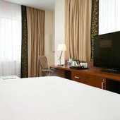 Вас ожидают просторные и светлые номера, в каждом из которых имеется удобная кровать, рабочий стол, кондиционер, телевизор со спутниковым TV, ванной комнатой со всеми необходимыми удобствами.