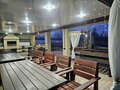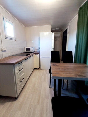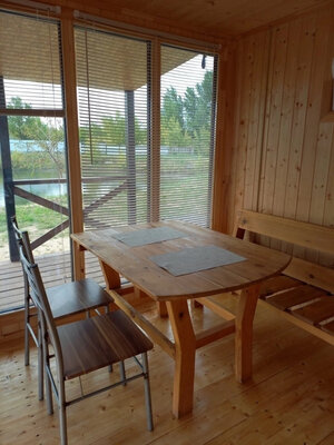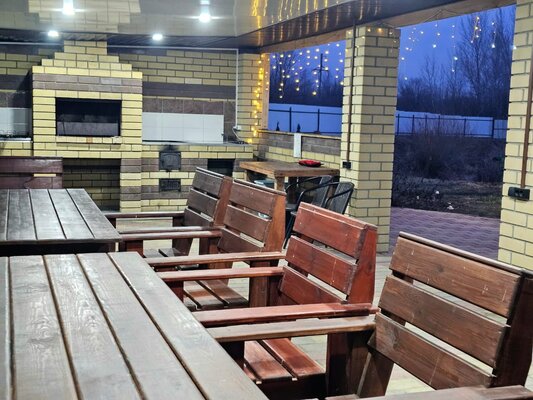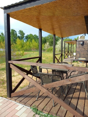 В беседке установлена вся необходимая мебель для большой компании, холодильник, чайник.