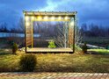 На против беседки — сцена. Можно использовать для мероприятий, выступления ведущего, артистов, проведения гендер-пати или выездного бракосочетания. Так же можно оформить сцену под ваш праздник и использовать для фотосессий.
