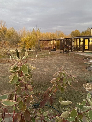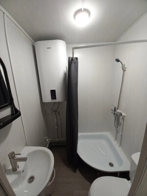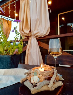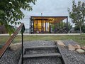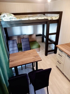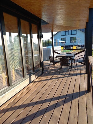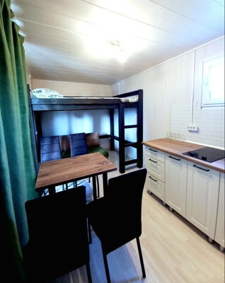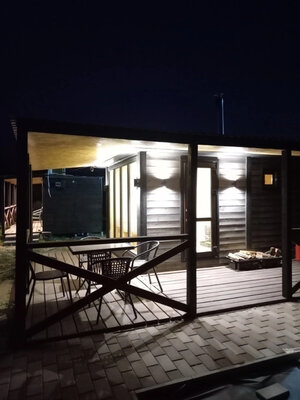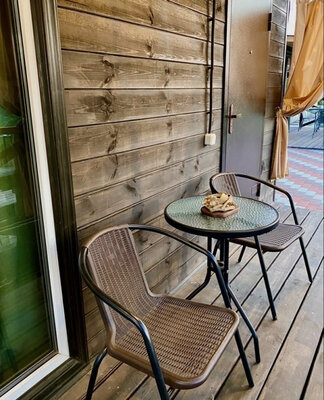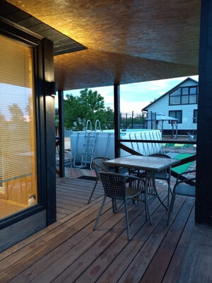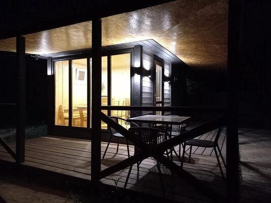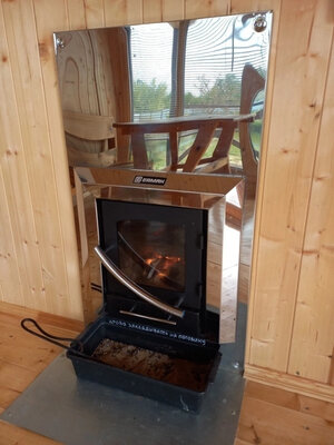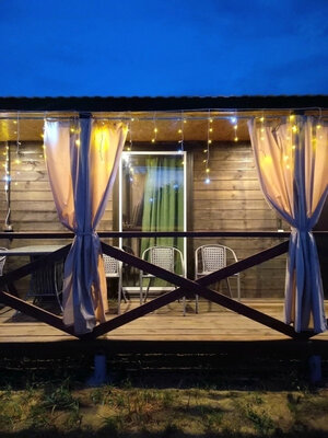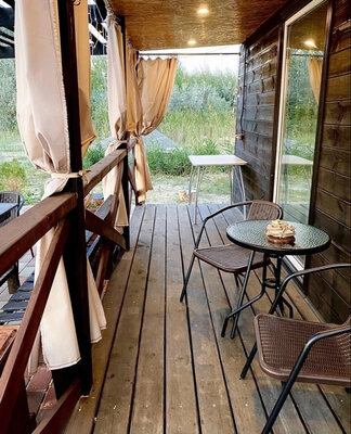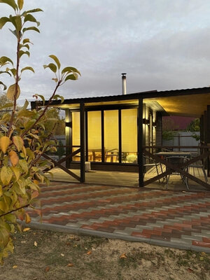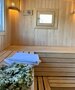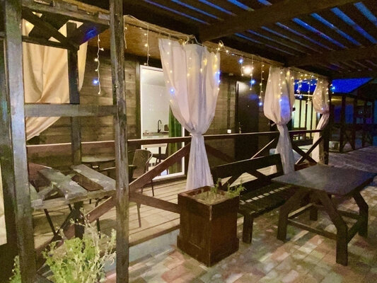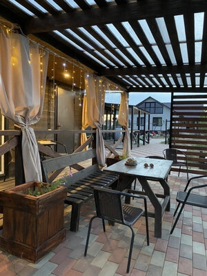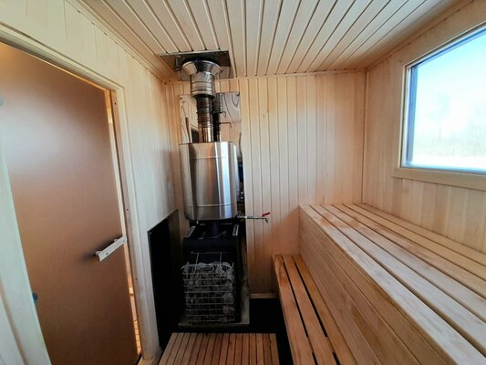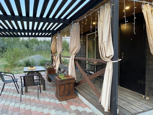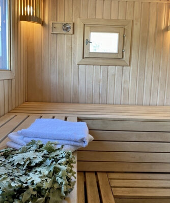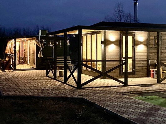 Баня с панорамными окнами и живым камином в комнате отдыха. Гостям предоставляется травяной чай, мед, букеты полевых трав для ароматерапии. У бани есть своя веранда и садовая мебель, где можно отдыхать на свежем воздухе. Так же можно охладиться в пруду после жаркого пара.