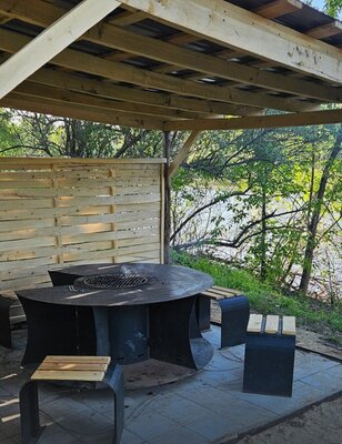 Под навесом уютно размещен гриль-стол с шестью стульями, который создает идеальные условия для дружеских встреч на свежем воздухе. Стол совмещает в себе жаровню и удобную столешницу, и вся компания может наслаждаться общением, не отвлекаясь от процесса приготовления.