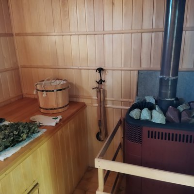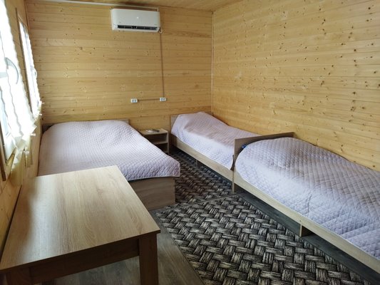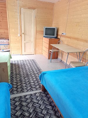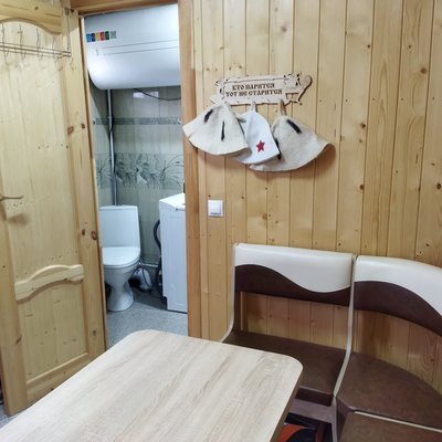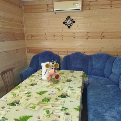 Кухня-гостиная с возможностью размещения 2 человек.(Двуспальный диван).Есть все необходимое, холодильник, микроволновка, посуда, горячая вода. Для отопления в зимнее время установлена печь на дровах!