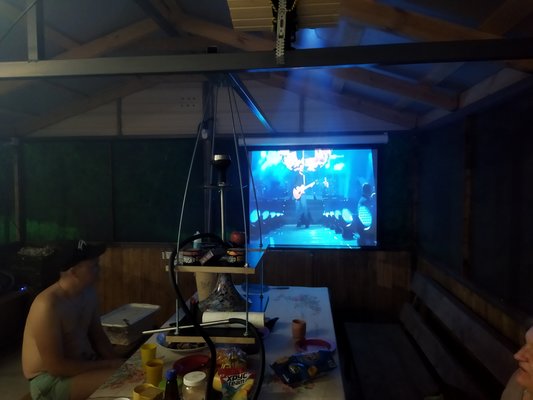 Летняя беседка с потрясающим видом на озеро! В беседке установлен мангал, проектор и подвесной столик для кальяна!