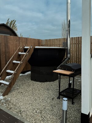 Высокий забор окружает банный чан с подогревом, создавая уединенное место для парения. Одной растопки достаточно на пять часов парения, чтобы мышцы расслабились, улучшилось кровообращение и укрепился иммунитет — это позволяет насладиться природой, снять напряжение и восстановить силы.