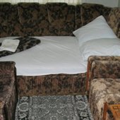 Мы вдвоем жили в просторном (примерно 35 кв. м) домике "Комфорт" со свежим ремонтом. Здесь есть все необходимое: двуспальная кровать и небольшая кушетка, кухонный уголок, холодильник, санузел с душем, телевизор, кондиционер, открытая веранда, на которой можно отдыхать весь день. Рядом с домом стоит мангал для любителей шашлыка, а решетку или шампуры можно взять напрокат у администратора.