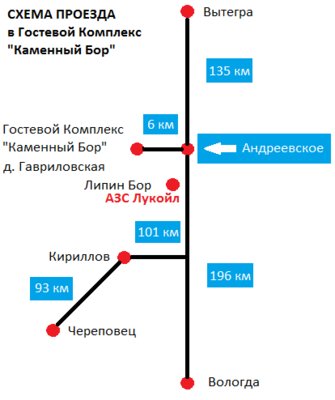 Из Санкт-Петербурга Вы можете добраться по направлению на Новую Ладогу (120 км), через Лодейное поле (103 км), Подпорожье (60 км), Вытегру (145 км). Далее по направлению на Вологду до указателя ГК «Каменный Бор» (135 км от Вытегры), поворот направо, 6 км от поворота по указателям до д. Гавриловская (Гостевой Комплекс "Каменный Бор"), (Общая протяжённость пути из Санкт-Петербурга составляет 570 км).