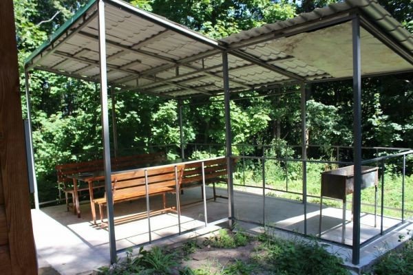 В малой беседке, рассчитанной на компанию до десяти человек, есть все, что нужно для приятного времяпрепровождения: свет, электрическая розетка и мангал рядом с ней. Также поблизости есть туалет с умывальником и уличная раковина, что делает пребывание гостей еще более комфортным.