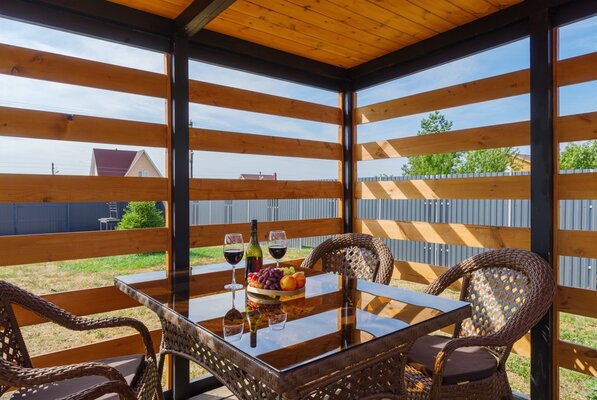 - уютная терраса и стильная беседка с ротанговой мебелью;
