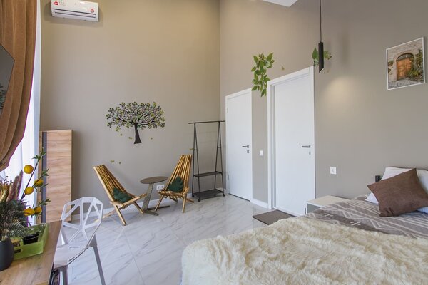 Для гостей предлагается 12 стильных и уютных номеров, оснащенных всем необходимым для комфортного пребывания. В каждом номере есть кондиционер, холодильник, посуда, телевизор с онлайн-кинотеатром, тапочки, халаты, туалетные принадлежности и чайный набор.
