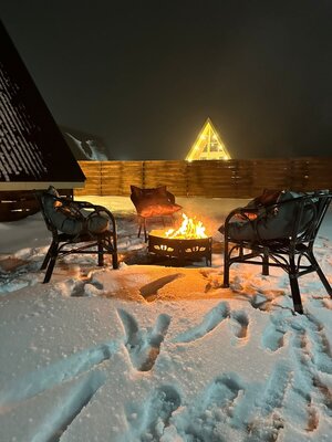 «Коричневый домик в стиле A-Frame с чаном» подходит для проживания в любое время года.