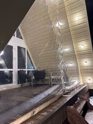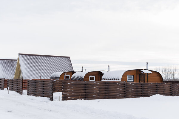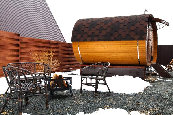 Загородный клуб По Щучьему Велению, коричневый домик в стиле A-Frame с чаном