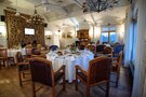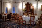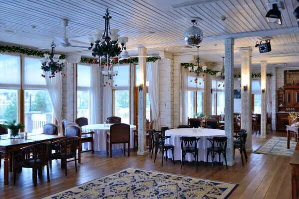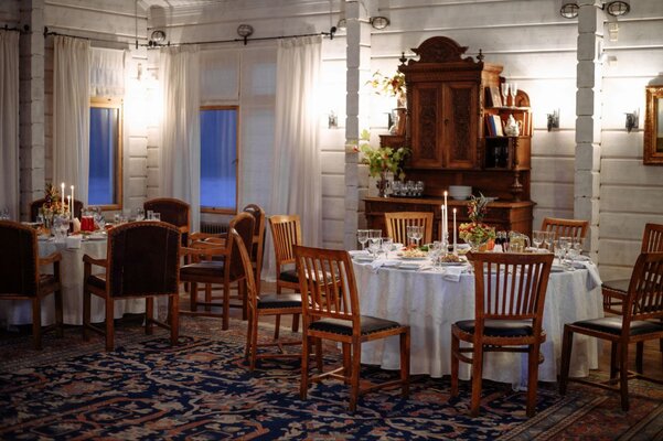 Первый этаж отдан обеденному залу, располагающему как к незабываемому романтическому вечеру, так и веселым дружеским торжествам. Роскошная парадная дворцовая лестница с резными столбцами ведет в барские кабинеты с охотничьими убранствами, где можно провести неформальные переговоры за игрой в русской бильярд или неспешно насладиться сигарой на кожаных диванах. Там же располагаются два обеденных зала, которые служат идеальным местом для семейных банкетов или деловых встреч.