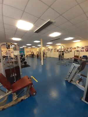 Просторный зал с множеством тренажеров.