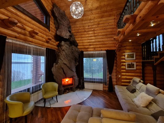В большом зале на первом этаже вас ждет гостиная с комфортной зоной отдыха и авторским дровяным камином, а также кухонная и столовая зоны с прекрасным видом на Волгу. Второй свет создает ощущение простора.
