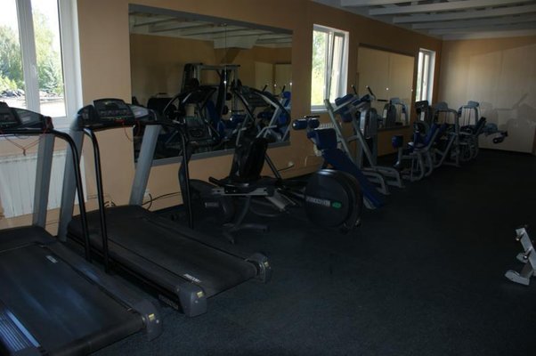 Тренажерный зал оснащен профессиональными тренажерами, такими как «беговая дорожка», «велотренажер», «лыжи» и др.