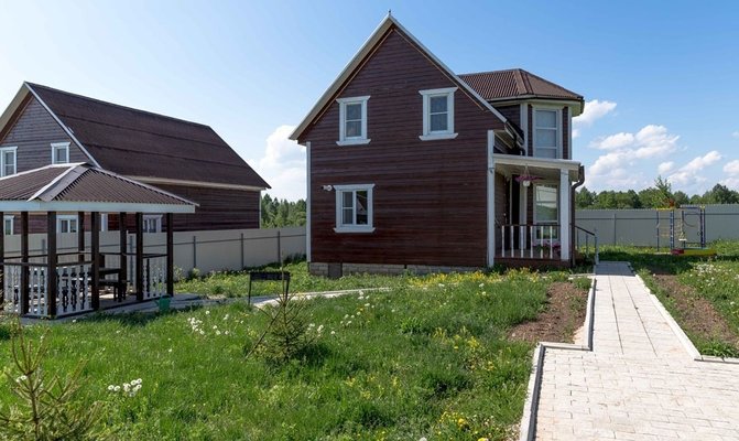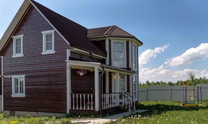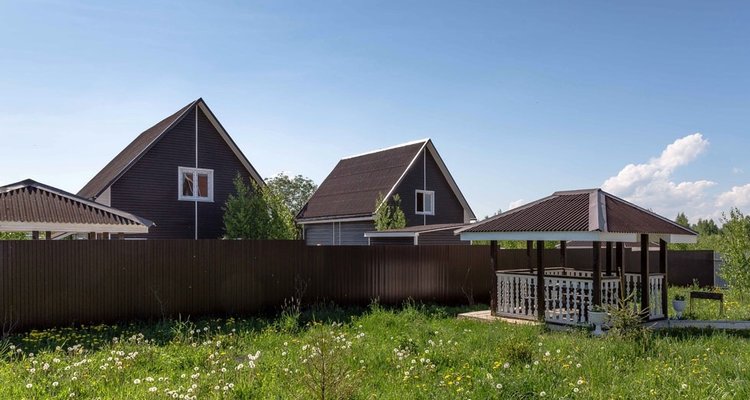 - При въезде в поселок вы увидите темно-коричневые дома Никитского подворья.