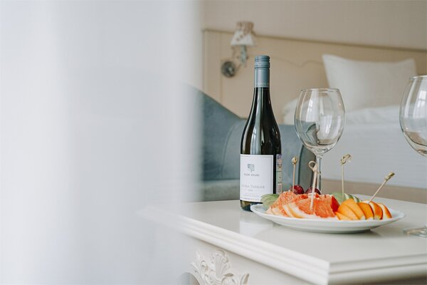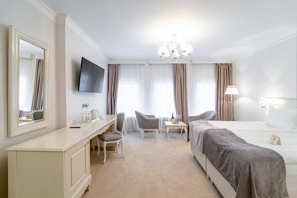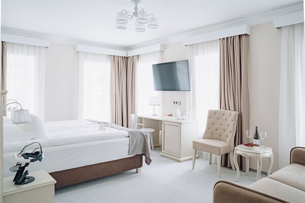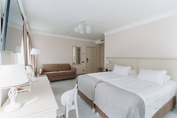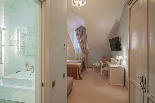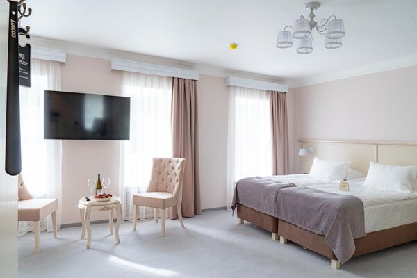 Рядом с отелем устроен аутентичный банный городок в окружении вековых сосен: здесь работают бани по‑черному и по‑белому, имеется открытый бассейн, финская сауна, две купели с подогревом до 35–40 °C, просторная беседка, барбекю‑зона и костровая площадка.