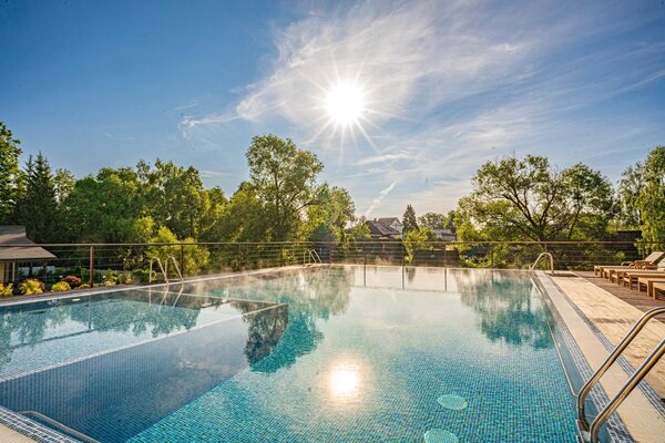 Крытый бассейн с системой противотоков площадью 19 кв. м. в сочетании с открытым бассейном 15 х 10 метров с водой из целебного источника. Финская парная с панорамной террасой.