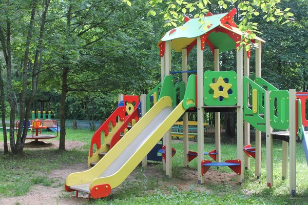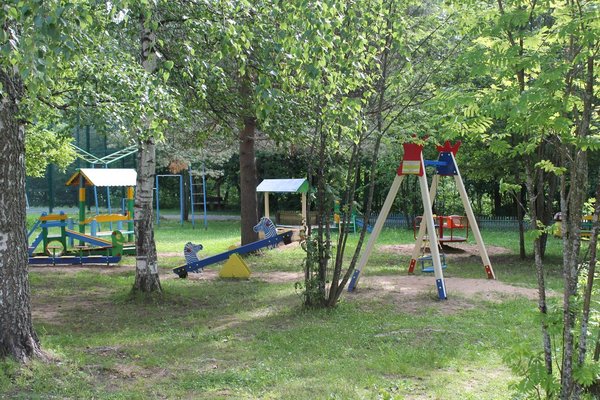 Для детей оборудована игровая площадка с качелями, горками и другими аттракционами.