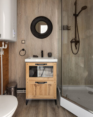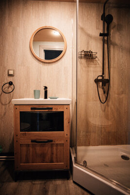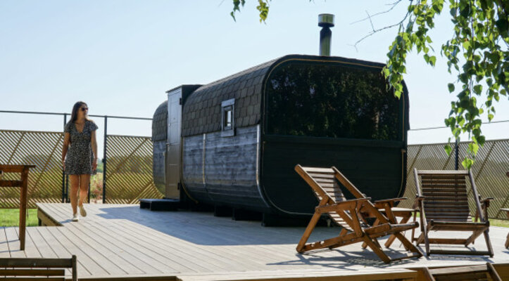 В стоимость услуги включена аренда 2 часа Баня-бочки. Внутри — комната-отдыха и раздевалка, помывочная с шайками и лейками по принципу русской бани, а также парная с панорамным окном.