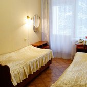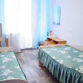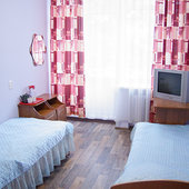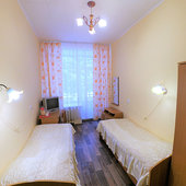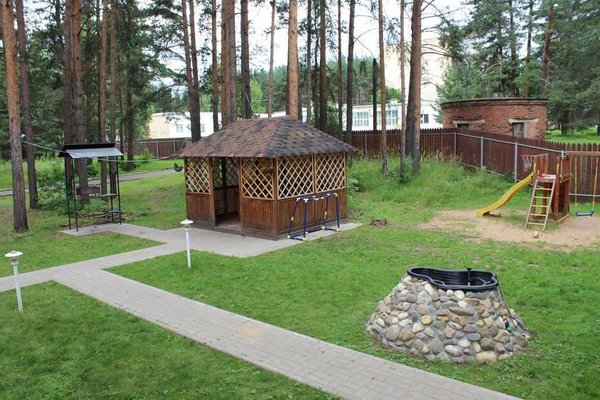 Шестиэтажное здание санатория соединено теплыми переходами со столовой и лечебным корпусом в единый комплекс, что делает его очень удобным для отдыхающих при любой погоде. Прилегающая лесная территория оборудована удобной для прогулок «Тропой здоровья».